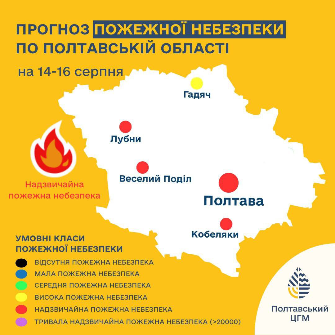Полтавський обласний центр з гідрометеорології попереджає: з 14 по 16 серпня на більшості територій Полтавської області, окрім північних районів, утримається надзвичайний рівень пожежної небезпеки.