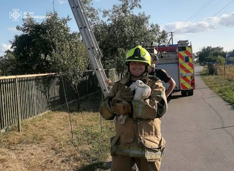 На місце прибули фахівці 7-го державного пожежно-рятувального поста. Використавши трьохколінну драбину, вони обережно зняли пташеня та передали до центру порятунку та реабілітації диких тварин.