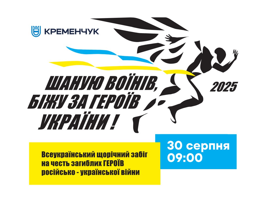Кременчуцька міська влада долучилась до Всеукраїнської ініціативи, що об’єднує тисячі людей з різних куточків країни. 30 серпня у центрі Кременчука відбудеться забіг «Шаную Воїнів, біжу за Героїв України», присвячений Дню пам’яті захисників і захисниць України.