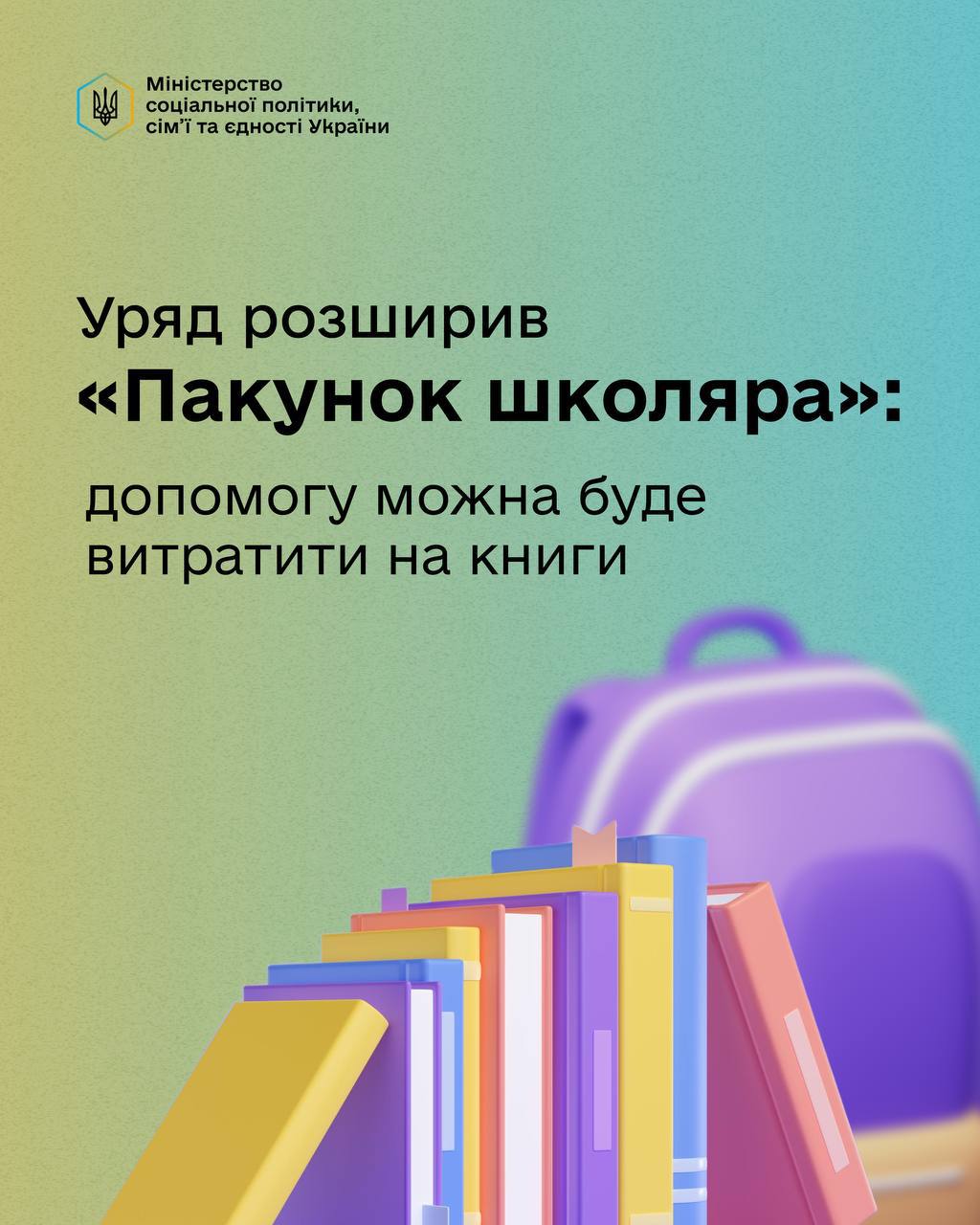 Уряд України ухвалив рішення про розширення програми «Пакунок школяра». Від 1 жовтня батьки зможуть витрачати кошти допомоги не лише на канцтовари та одяг для дітей, а й на книги. Це рішення враховує потреби сімей та дає можливість обирати ті товари, які найбільше потрібні для навчання.