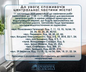 Для отримання оперативної інформації звертатись у диспетчерську службу КП «Кременчукводоканал» за телефонами: 050-305-45-71, 067-403-97-86.
