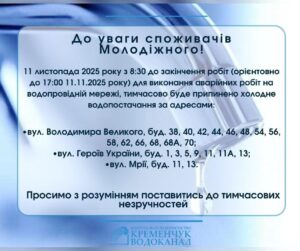 Увага, мешканці Молодіжного та центральної частини Кременчука! 11 листопада у зазначених районах тимчасово буде відсутнє водопостачання.